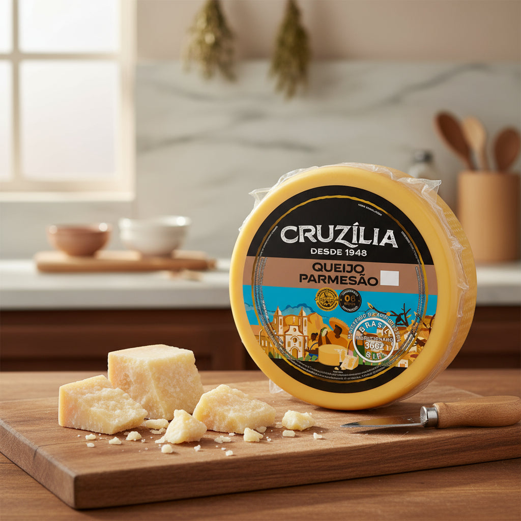 Queijo Parmesão Maturado Inteiro 6 kg - Queijos Cruzília Minas Gerais Um dos queijos mais emblemáticos da tradição europeia. Com raízes na região de Parma, na Itália, o Parmesão é um dos clássicos que atravessa uma geração de paladares. De textura firme e quebradiça, seu sabor intenso e marcante conquista desde os apreciadores mais exigentes até os que estão começando no universo dos queijos. Harmonizado, revela toda sua nobreza ao lado de sabores que equilibram sua intensidade. Com a intensidade delicada da copa, o contraste adocicado da compota de frutas vermelhas, a crocância marcante e sabor pronunciado das avelãs tostadas e o toque surpreendente da mostarda em grãos, com suas notas picantes. Cada combinação traz uma experiência diferente com o Parmesão.