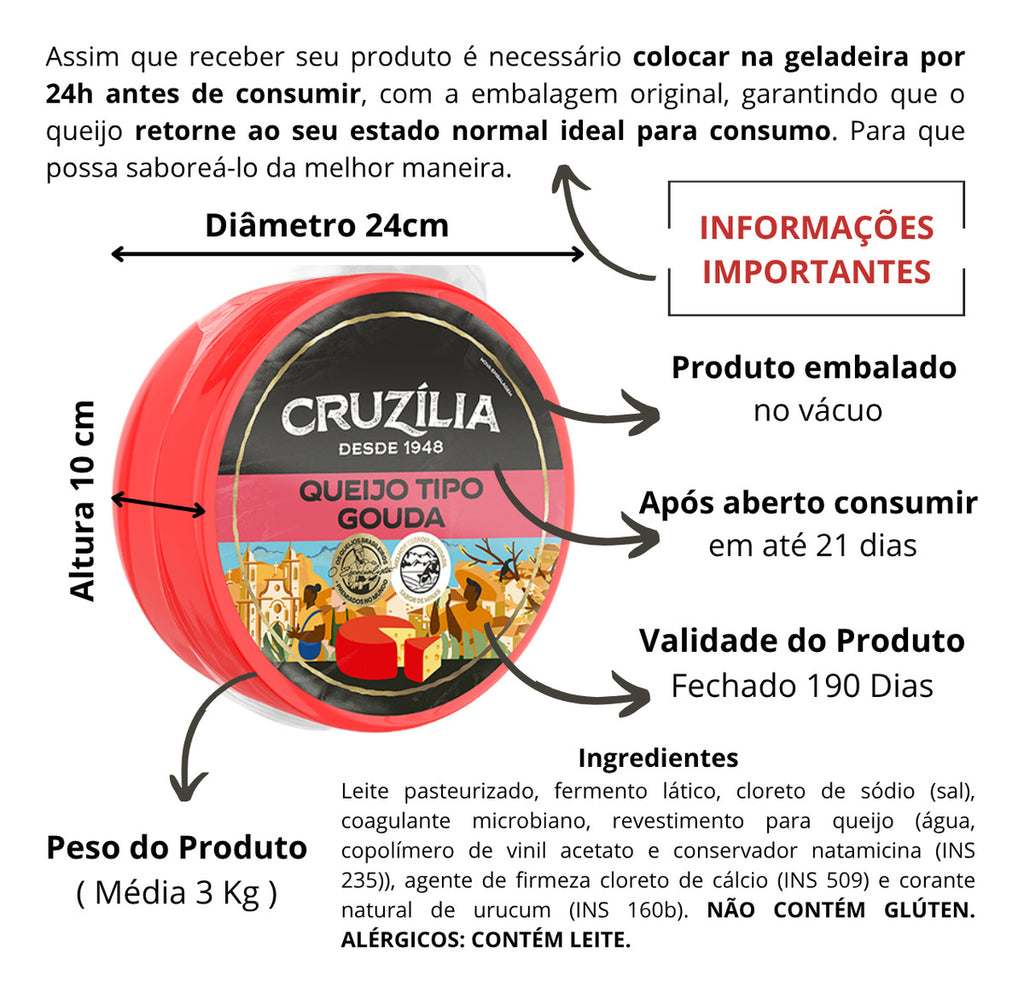 Queijo Gouda Cremoso Artesanal Inteiro 3Kg - Queijos Cruzília Inspirado na tradicional receita holandesa, o Queijo Gouda Cruzília carrega a alma Mineira com a autenticidade da Serra da Mantiqueira. Produzido com leite fresco e selecionado da região e fermentos nobres, entrega uma textura cremosa e um sabor suave com notas levemente adocicadas que encantam desde o primeiro pedaço. Cada fatia é uma experiência sensorial que revela tradição, terroir e excelência artesanal. Reconhecido por especialistas e amado por quem valoriza qualidade, o Gouda Cruzília é ideal para tábuas sofisticadas, harmonizações ou momentos especiais. Prove o verdadeiro sabor da elegância.