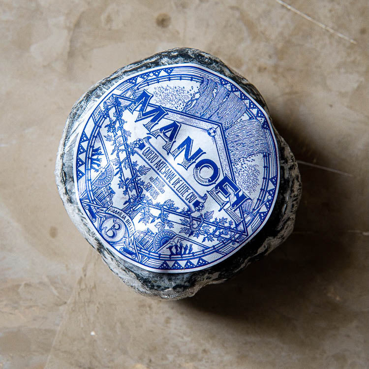 Queijo artesanal de leite cru produzido a partir de um único rebanho, garantindo qualidade e rastreabilidade. Maturado em ambiente de baixa temperatura e alta umidade com uso de carvão vegetal, apresenta casca escura com mofos naturais que contrastam com a massa branca e limpa do interior.