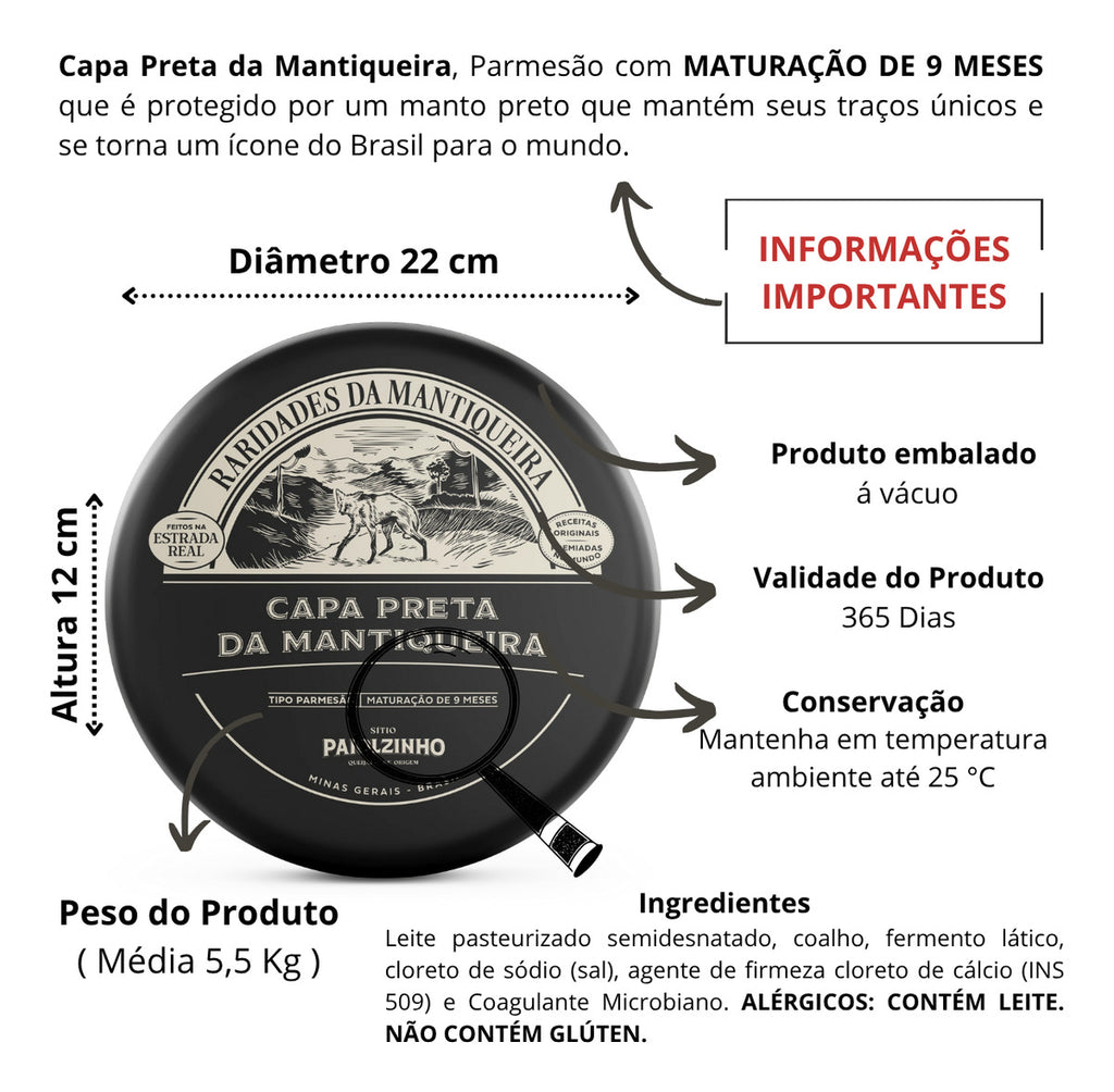 Queijo Parmesão Capa Preta Artesanal Maturado 5 Kg - Queijos Paiolzinho Gourmet Entre montanhas, brumas e pastagens naturais da Serra da Mantiqueira, nasce o Capa-Preta do Sítio Paiolzinho — uma raridade com alma mineira e terroir incomparável. Envolto por uma resina nobre que preserva e intensifica seu sabor e aroma, esse queijo carrega a elegância da tradição e a força da natureza. Sua embalagem homenageia o Lobo-Guará, símbolo da fauna local e da liberdade selvagem. Produzido artesanalmente por mestres queijeiros que transformam o mais puro leite em sabores autênticos, esse parmesão é uma verdadeira joia gourmet para paladares exigentes e apaixonados por origem.